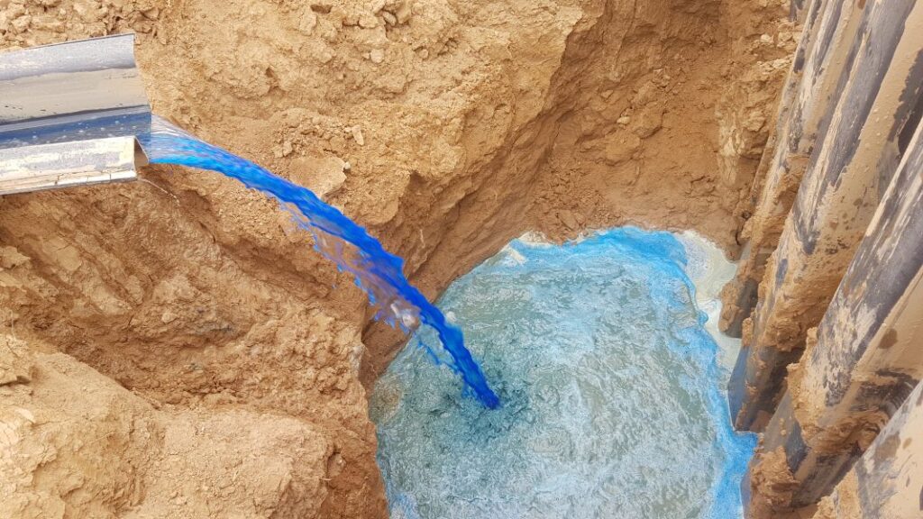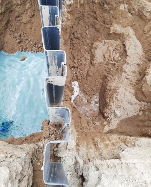 After the trial section was completed, the client wanted to make sure that the sheet piles formed a 100% watertight barrier. A number of tests were conducted on the vinyl sheet pile locks, which consisted of digging up the sheet piles installed in the ground on both sides to a depth of 4 m, and then pouring water coloured with ink into the trench on one side.