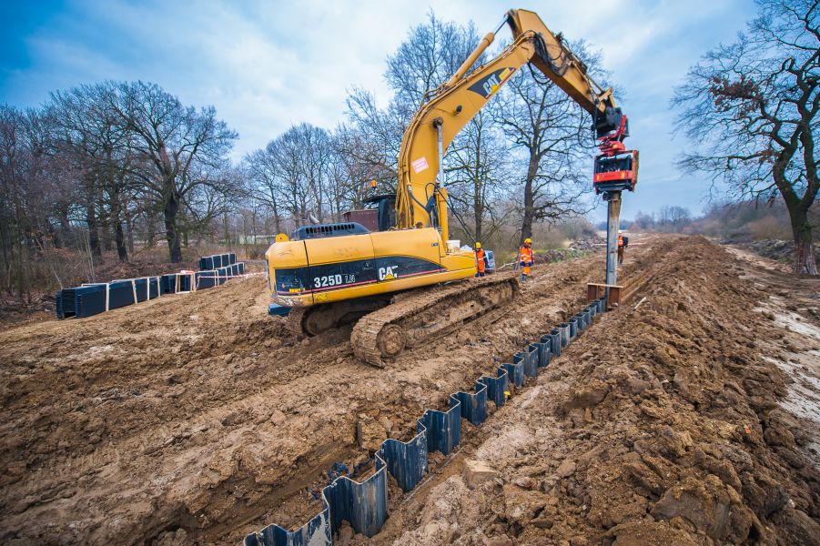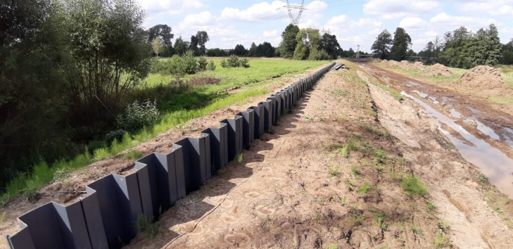 Another huge project using vinyl sheet piles is a multi-stage project of modernization, reconstruction and strengthening of flood protection infrastructure of the Warta River in the Częstochowa region, Central Poland. The works were carried out in several stages with the total length of the levees to be reinforced in this project amounting to nearly 19 km. The lengths of the profiles (4.0 m and 5.5 m) have been selected in such a way as to reinforce the embankment but, at the same time, allow the flow of groundwater from the area beyond the levees towards their natural estuary, i.e. the Warta River. It was assumed that groundwater would flow under the structure. In the event of heavy rains, this solution ensures quick drying of arable land and residential areas located east of the river.