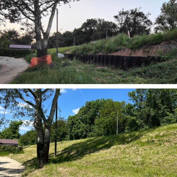 Steel sheet piles were to be driven into the base of the flood wall, and a bentonite mat was to be attached to the upper edge of the structure, covering the water adjacent side of the embankment to prevent the water from filtering through the embankment above the sheet piles.
