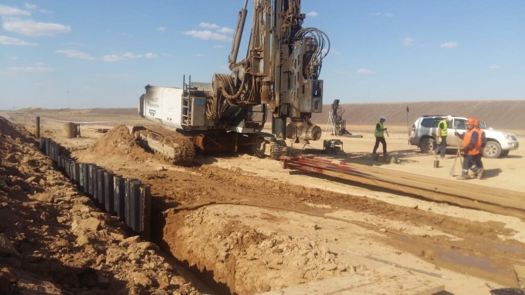 In the case of the project carried out in Kazakhstan, vinyl sheet piles GW-610/7.2 and GW-610/9 (wall thickness of 7.2 and 9 mm, respectively) were fully driven into the ground to form a 9 kilometers long cut-off wall around a Tailings Dam. The length of the sheet piles ranged from 6 to 11 m. The structure made of vinyl sheet piles was to form a tight barrier in the ground protecting the surrounding area against the seepage of toxic waste stored in the reservoir, which could have occurred in the layer of permeable soil formed with a layer of sandy silt and very dense silty sands. The solution to the problem was to drive vinyl sheet piles with gaskets to the depth of 1 m into the impremeable layer of fat clay. The task was completed without major problems, thanks to the following factors: