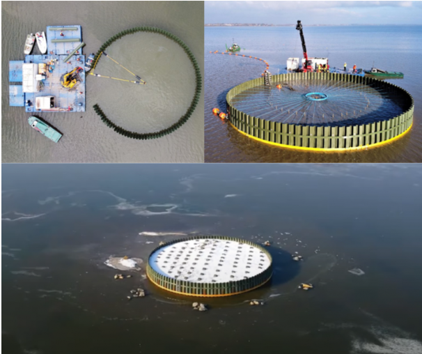 Przykładem projektu realizowanego na zasadach opisanych powyżej może być projekt LIFE.VISTULA.PL realizowany na obszarze Natura 2000 w obrębie Zbiornika Goczałkowickiego i na stawach hodowlanych znajdujących się w jego pobliżu [3]. Głównym celem projektu nadzorowanego przez Regionalną Dyrekcję Ochrony Środowiska w Katowicach jest ochrona i poprawa 100% siedlisk krajowej populacji ślepowrona oraz 7% populacji krajowej rybitwy rzecznej w Dolinie Górnej Wisły. W ramach projektu grodzice winylowe posłużyły do wzmocnienia grobli oraz przede wszystkim budowy sztucznych wysp dla ptaków. Pierwszy z tych ciekawych obiektów został zbudowany na Zbiorniku Goczałkowickim. Poziom wody w miejscu gdzie ptaki w suchych miesiącach zakładały swoje gniazda był bardzo niski, jednakże w późniejszych miesiącach, w wyniku wzmożonych deszczy, poziom wody radykalnie wzrastał powodując, że siedliska były niszczone. Rzędna góry ścianki winylowej znajduje się 3m nad poziomem dna zbiornika. W celu zachowania statyki konstrukcji na dwóch poziomach zabezpieczono ją obejmami, a w jednej z nich rozprowadzono są specjalnie przygotowane ściągi (rys. 2).