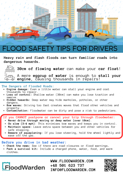 - Loss of control: As little as 30cm of flowing water can cause a vehicle to lose traction, increasing the risk of accidents.